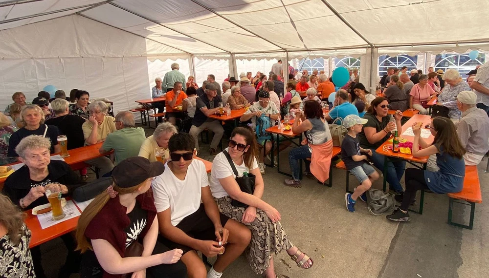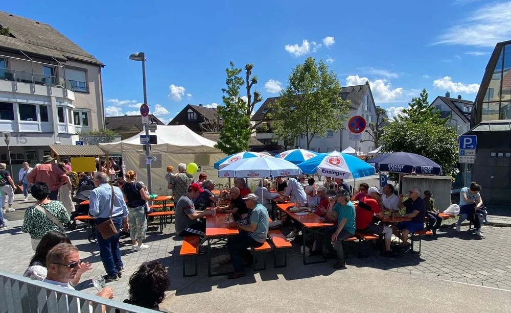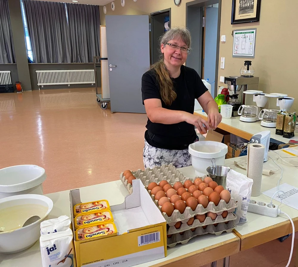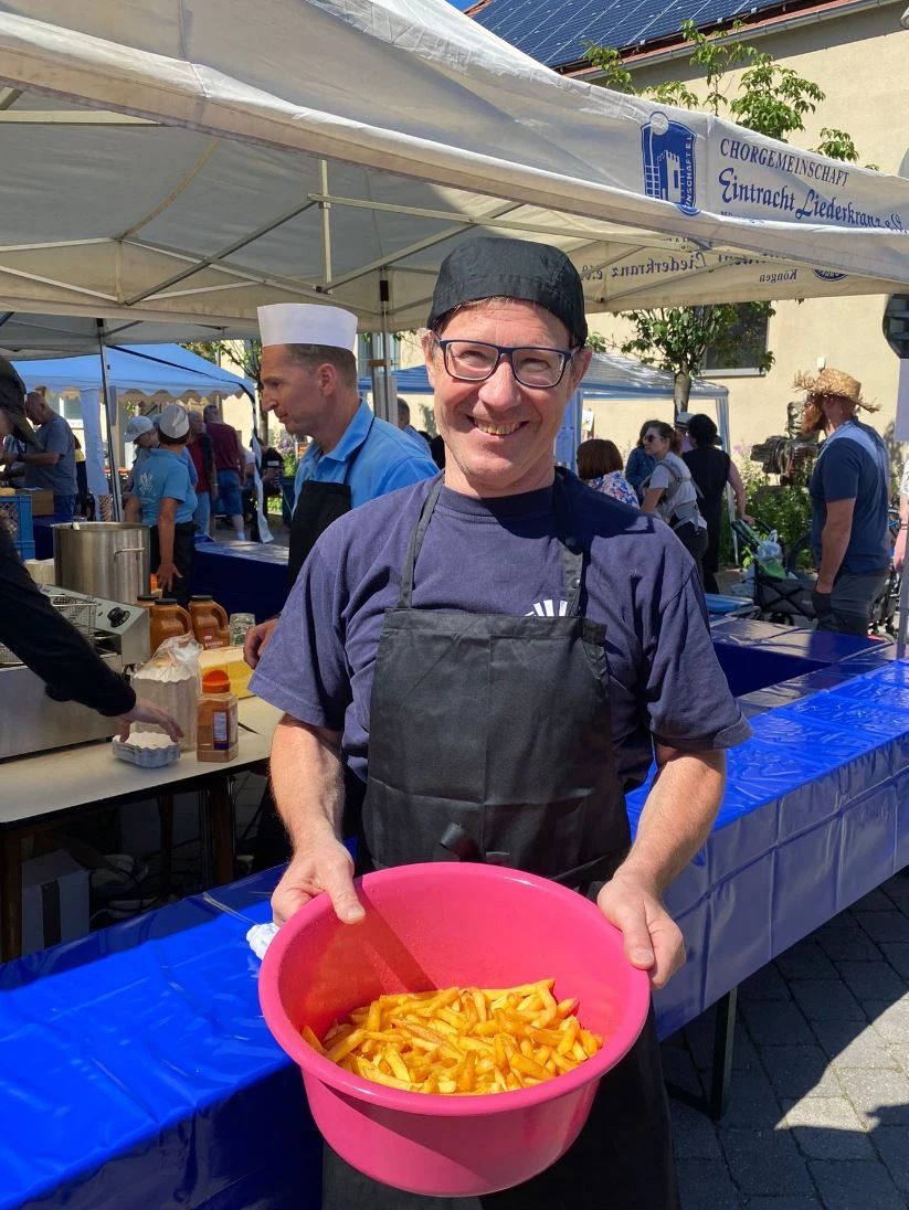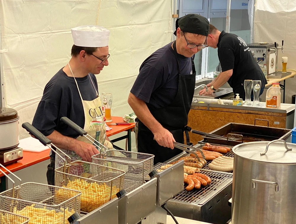 Auf mehrere Stände verteilt, unterscheidet sich das Angebot. Während draußen die typischen Speisen für „auf die Hand" verkauft werden, ist in einem Gebäude das schwäbische Mittagessen mit Maultaschen im Angebot. Die 50 Helfer und Helferinnen sind dafür um 5 Uhr aufgestanden, damit sie um 6 Uhr mit dem Aufbau beginnen können. 16 Kilo Mehl werden dabei fur die Waffeln verarbeitet, 80 Kilo Pommes frittiert und 16 Kuchen gebacken. Fast 1000 Stücke Fleisch und Wurst werden gegrillt und Unmengen Ketchup-Tütchen verbraucht. Es ist für alle ein langer Tag, aber sie sind mit Begeisterung dabei.