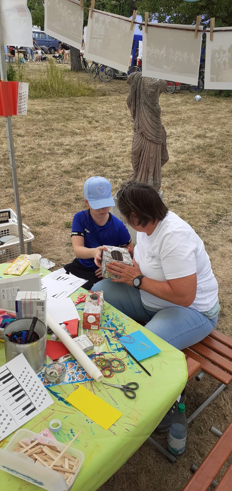 Am Basteltisch entstanden u.a. kleine Rasseln, Trommeln und eine „Mundharmonika“ aus Eisstäbchen.
